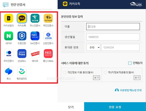 (3) 국세청 홈택스 간편 인증인 카카오뱅크, 카카오톡, 네이버등 다양한 간편 인증을 통해 인증을 요청하여 로그인을 합니다.